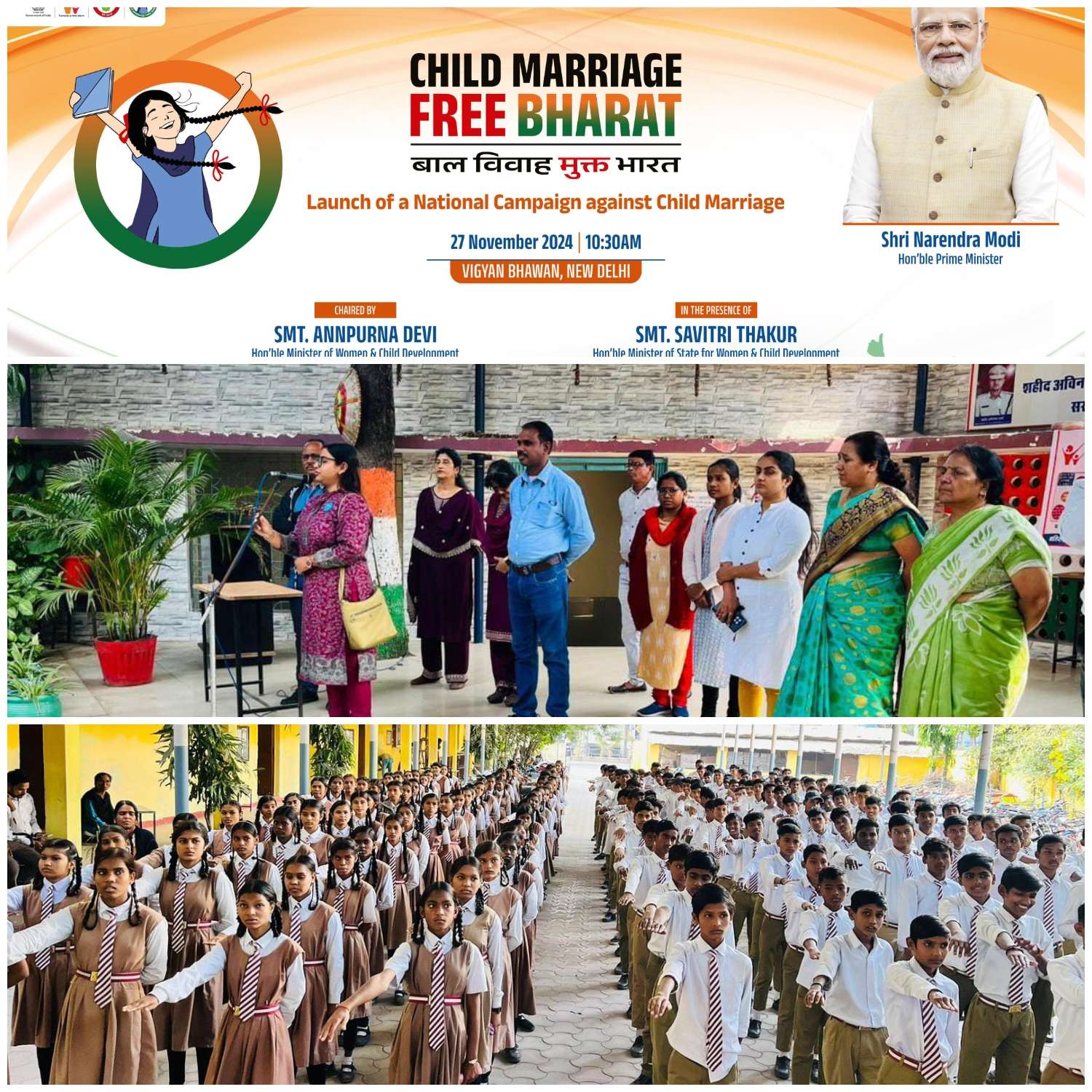 बाल विवाह मुक्त भारत अभियान का शुभारंभ केंद्रीय महिला एवं बाल विकास मंत्री अन्नपूर्णा देवी और केंद्रीय राज्य मंत्री महिला एवं बाल विकास विभाग सावित्री ठाकुर द्वारा किया गया। दिल्ली के विज्ञान भवन से अभियान का शुभारंभ हुआ । इस अवसर पर जिले के विभिन्न स्कूलों में शपथ ली गई और बाल विवाह मुक्त प्रदेश बनाने की शपथ ली गई। स्कूली बच्चों ने बाल विवाह रोकने और इसके प्रति जागरूकता की शपथ ली। कन्या शाला स्कूल नूतन चौक और शासकीय स्कूल राजेंद्रनगर में शपथ ग्रहण कार्यक्रम का आयोजन किया गया। इस अवसर पर जिला बाल संरक्षण इका ई के सदस्य, यूनिसेफ जिला सलाहकार रूमाना खान ,सी3 संस्था से महेश झरखर द्वारा बाल विवाह के दुष्परिणामों के विषय में जानकारी दी गई। बाल संरक्षण की दिशा में कार्य कर रहे संस्थाओं के सदस्यों ने कहा के इस विषय पर सामाजिक जागरूकता से सकारात्मक बदलाव संभव है।