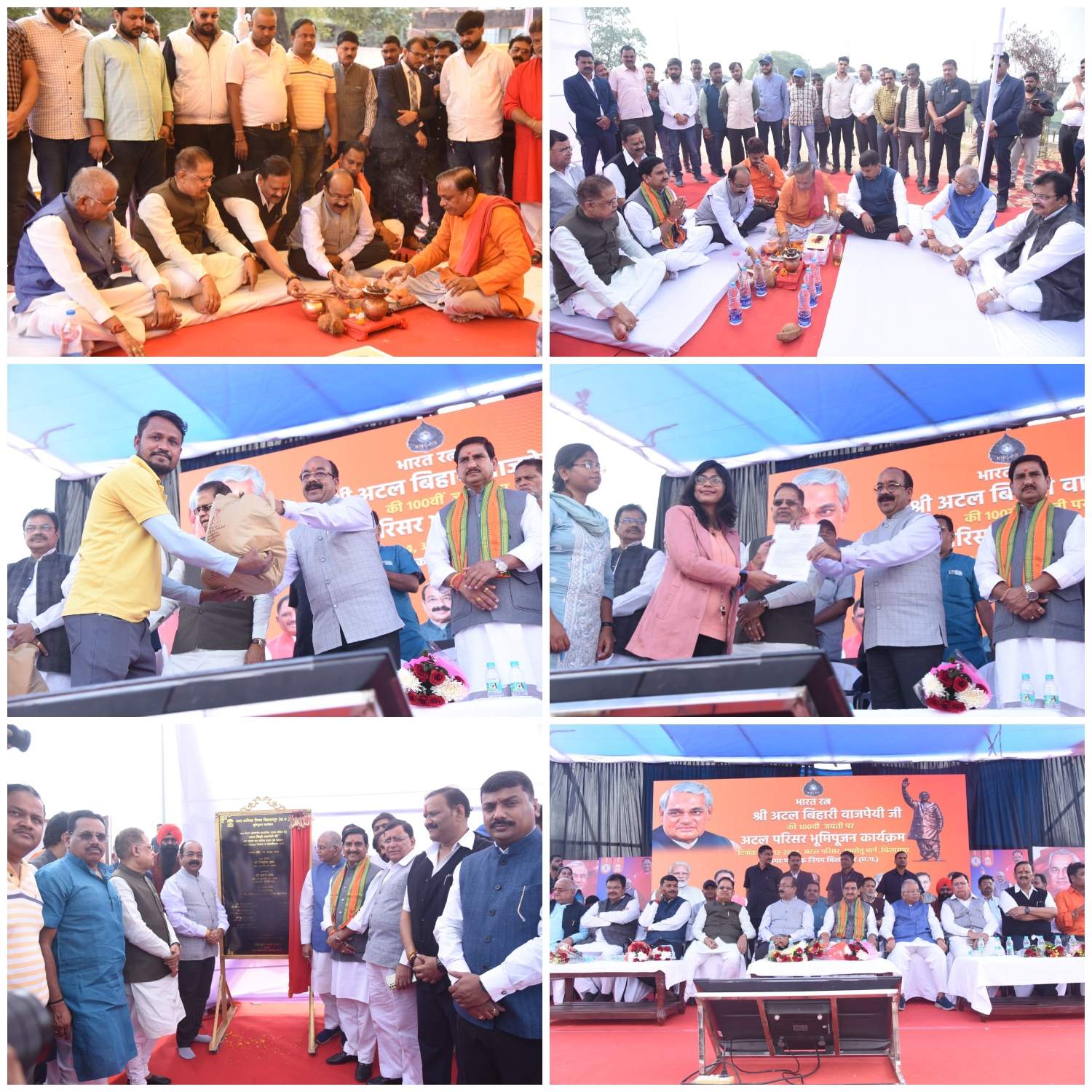 बिलासपुर // भारत के पूर्व प्रधानमंत्री भारत रत्न स्व. श्री अटल बिहारी वाजपेयी की 100 वीं जयंती के उपलक्ष्य में सुशासन दिवस के अवसर पर उप मुख्यमंत्री श्री अरूण साव ने 50 लाख की लागत से बनने वाले अटल परिसर का भूमिपूजन किया गया। उप मुख्यमंत्री ने इस अवसर पर रिवर व्यू रोड को अटल पथ के नाम किए जाने और चौक को अटल चौक के नाम से किए जाने की घोषणा की। भूमिपूजन कार्यक्रम में केन्द्रीय आवासन एवं शहरी राज्य विकास मंत्री श्री तोखन साहू विशिष्ट अतिथि और बिलासपुर विधायक अमर अग्रवाल, बेलतरा विधायक सुशांत शुक्ला, बिल्हा विधायक धरमलाल कौशिक मंचस्थ रहे।