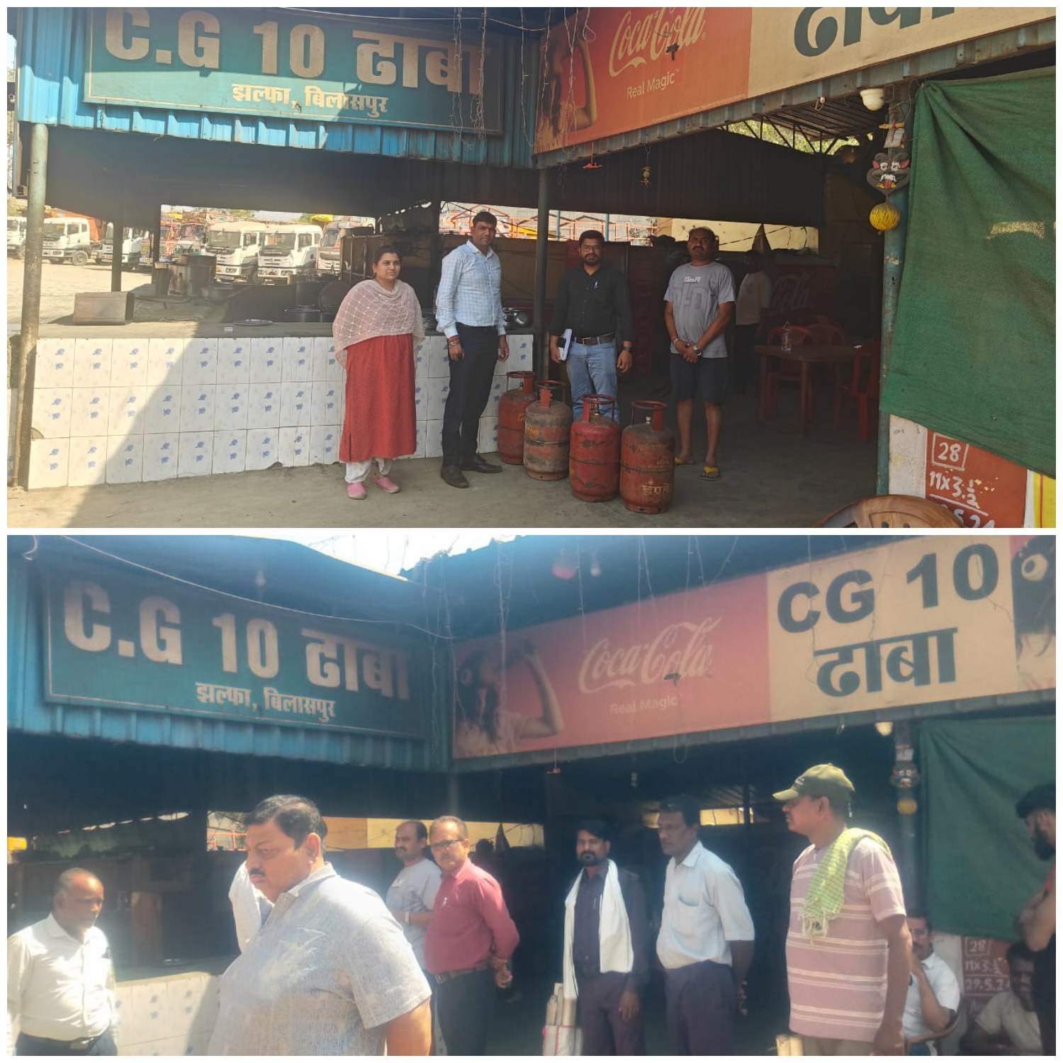 बिलासपुर // कलेक्टर अवनीश शरण के निर्देश पर एसडीएम बिल्हा के मार्गदर्शन में पेंड्राडीह बायपास के पास स्थित ढाबों का राजस्व विभाग, एनएचआई एवं फूड विभाग द्वारा ढाबों का छापामार कार्रवाई की गई। जिसमें सीजी 10 ढाबा संचालक राकेश शर्मा के पास से 4 घरेलू गैस सिलेंडरों का व्यवसायिक उपयोग करते हुए पाए जाने पर जब्त किया गया। इसी प्रकार राज भोजनालय संचालक कृष्ण कुमार कौशिक के पास से 4 घरेलू सिलेंडर उपयोग करते हुए पाए जाने पर जप्त किया गया। दोनों के विरुद्ध आवश्यक कार्रवाई की जा रही है।इस दौरान नायब तहसील बोदरी ओमप्रकाश चंद्रवंशी, राजस्व निरीक्षक शैलेश गढ़वाल , फूड इंस्पेक्टर मंगेश कांत, एनएचआई के अधिकारी/कर्मचारी, हल्का पटवारी उपस्थित थे।
