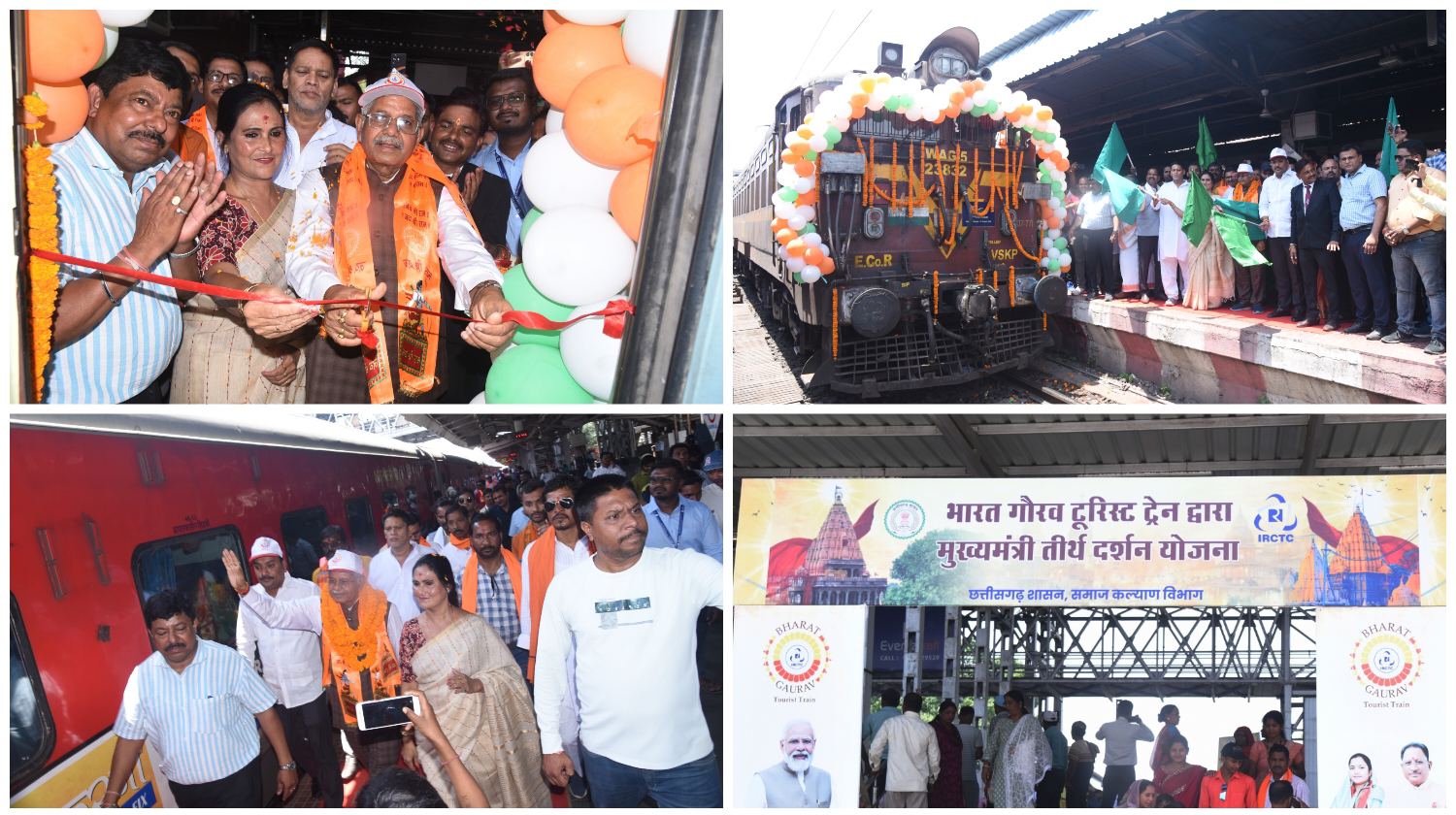 बिलासपुर // मुख्यमंत्री विष्णुदेव साय की विशेष पहल पर पांच साल के लम्बे अंतराल के बाद मुख्यमंत्री तीर्थ दर्शन योजना शुरू हुई है। योजना के तहत आज बिलासपुर जिले के 775 यात्रियों का पहला जत्था पुरी, भुवनेश्वर, कोणार्क दर्शन के लिए रवाना हुआ। यात्रियों ने योजना के लिए प्रधानमंत्री श्री नरेन्द्र मोदी और मुख्यमंत्री श्री विष्णुदेव साय के प्रति आभार व्यक्त किया। बिलासपुर, मुंगेली और जीपीएम जिले के तीर्थ यात्री बिलासपुर स्टेशन पर पहुंचे जहां पर जनप्रतिनिधि और प्रशासनिक अधिकारियों ने तीर्थयात्रियों का तिलक लगाकर और माला पहनाकर स्वागत किया। ट्रेन को बिल्हा विधायक श्री धरमलाल कौशिक, बेलतरा विधायक श्री सुशांत शुक्ला ने हरी झण्डी दिखाकर रवाना किया। यात्रियों को भारत गौरव टूरिस्ट ट्रेन द्वारा रवाना किया गया। तीर्थ यात्रा की बरसो पुरानी अभिलाषा पूरी होने पर बुजुर्गो के आंखों की चमक देखते बन रही थी। इस अवसर पर महापौर श्रीमती पूजा विधानी, जिला पंचायत अध्यक्ष श्री राजेश सूर्यवंशी सहित अन्य जनप्रतिनिधि एवं नगर निगम कमिश्नर श्री अमित कुमार मौजूद थे।