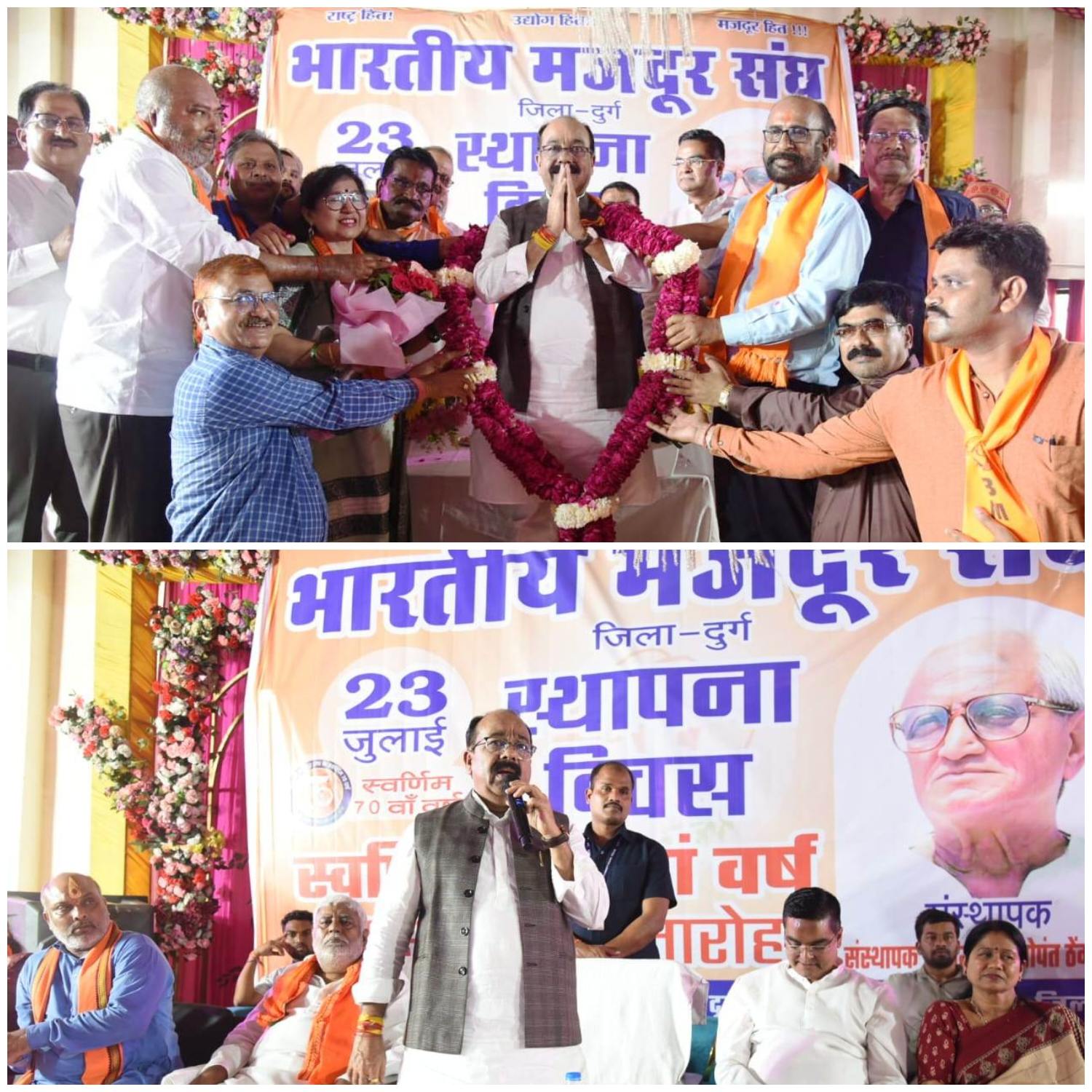 पूर्व विधानसभा अध्यक्ष श्री प्रेम प्रकाश पाण्डेय ने कार्यक्रम में भारत की आजादी के बाद गठित विभिन्न मजदूर संघों और उनकी विचारधारा के बारे में विस्तार से जानकारी दी। विधायक श्री रिकेश सेन ने अपने सम्बोधन में कहा कि भारतीय मजदूर संघ एक संगठन नहीं विचारधारा है। विधायक श्री ललित चन्द्राकर ने कहा कि संघ मजदूरों के हितों के साथ ही राष्ट्रीय हित के लिए भी काम करते आ रहा है। भिलाई में बड़ी संख्या में मजदूर विभिन्न औद्योगिक संस्थानों में कार्यरत् हैं। वे सभी भारतीय मजदूर संघ से जुड़े हैं। स्थापना दिवस कार्यक्रम में भारतीय मजदूर संघ के पदाधिकारी, गणमान्य नागरिक, मजदूर और बड़ी संख्या में नागरिक उपस्थित थे।