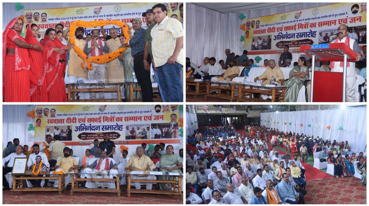 बिलासपुर :— उप मुख्यमंत्री एवं जिले के प्रभारी मंत्री श्री अरूण साव ने आज बिल्हा नगर पंचायत के कन्या भवन में स्वच्छता दीदियों और सफाई मित्रों का सम्मान किया। स्वच्छता के क्षेत्र में ऐतिहासिक उपलब्धि हासिल करते हुए बिल्हा नगर पंचायत ने स्वच्छता सर्वेक्षण 2024-25 में 20 हजार से कम आबादी वाले शहरों की श्रेणी में देशभर में प्रथम स्थान प्राप्त किया है। उन्होंने स्वच्छता दीदियों से कहा कि छत्तीसगढ़ को बहुत बड़ी प्रतिष्ठा आपके कारण ही मिली है। स्वच्छता ने आज जन आंदोलन का रूप ले लिया है। देश में पहला स्थान हासिल करना हमारे लिए गौरव का विषय है। अब हमे इसे बरकरार रखना होगा। बिल्हा के एक-एक व्यक्ति को स्वच्छता के लिए संकल्प लेना होगा। उप मुख्यमंत्री ने कहा कि बिल्हा के विकास के लिए पैसों की कोई कमी नहीं होगी। उन्होंने सभी को स्वच्छता की शपथ भी दिलाई। कार्यक्रम में बिल्हा विधायक श्री धरमलाल कौशिक, क्रेडा अध्यक्ष श्री भूपेन्द्र सवन्नी, नगर पंचायत अध्यक्ष वंदना जेण्ड्रे, उपाध्यक्ष श्री सतीश शर्मा, जनपद अध्यक्ष राम कुमार कौशिक, एसडीएम श्री बजरंग वर्मा, सीएमओ श्री प्रवीण गहलोत, स्वच्छता दीदी, सफाई मित्र, कमांडो और बड़ी संख्या में नगरवासी मौजूद थे।