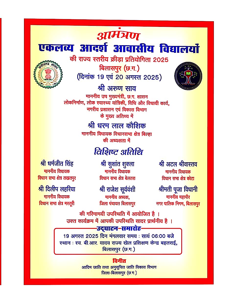 बिलासपुर // एकलव्य आदर्श आवासीय विद्यालयों की राज्य स्तरीय क्रीड़ा प्रतियोगिता 19 एवं 20 अगस्त को बिलासपुर में आयोजित की गई है। भारत सरकार के जनजातीय कार्य मंत्रालय के निर्देशानुसार आयोजित इस प्रतियोगिता में लगभग 2 हजार खिलाड़ी एवं अधिकारी-कर्मचारी शामिल होंगे। व्यक्तिगत और सामूहिक मिलाकर कुल 20 खेलों में प्रतियोगिता होगी। कलेक्टर संजय अग्रवाल ने इस विशाल आयोजन की सफलता के लिए विभिन्न विभागों और अधिकारियों को जिम्मेदारी सौंपी है। प्रतियोगिता का उद्घाटन एवं समापन समारोह बहतराई स्थित राज्य खेल प्रशिक्षण केन्द्र में होगा। शुभारंभ 19 को सवेरे 11 बजे एवं समापन 20 अगस्त को दोपहर 3 बजे होगा। व्यक्तिगत प्रतियोगिता के अंतर्गत 13 खेल एवं सामूहिक के अंतर्गत 7 खेल शामिल किये गये हैं। व्यक्तिगत प्रतियोगिता में तीरंदाजी, एथलेटिक्स, जुडो, ताईक्योंडो, वेटलिफ्टिंग, कुश्ती फ्री स्टाईल,योग, शतरंज, बेडमिन्टन, टेबल टेनिस, टेनिस, तैराकी और बॉक्सिंग रखी गई है। सामूहिक खेल के अंतर्गत हॉकी, कबड्डी, बॉस्केटबाल, फुटबाल, हैण्डबाल, खो-खो तथा बॉलीबॉल आयोजित की जायेगी। ये प्रतियोगिताएं बहतराई स्टेडियम के अलावा पिंक स्टेडियम गांधी चौक एवं बिलासा कॉलेज, संजय तरण पुष्कर,रेलवे बॉक्सिंग रिंग, पुलिस मैदान, सांईंस कॉलेज आदि स्थलों पर आयोजित किये जाएंगे। महिला एवं पुरूष वर्ग के खिलाड़ियों के लिए शहर के अलग-अलग छात्रावासों में ठहरने की व्यवस्था की गई है।