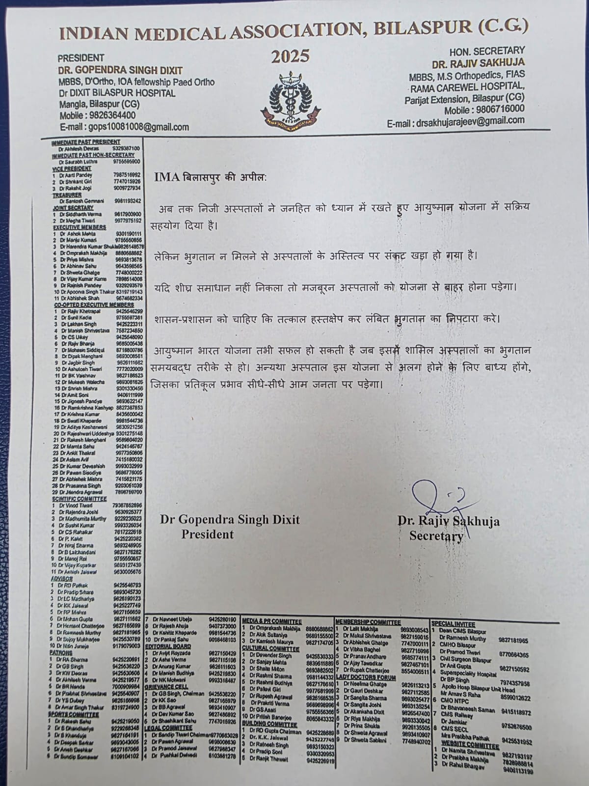 IMA बिलासपुर ने सर्वसम्मति से निर्णय लिया कि यदि 31 अगस्त 2025 तक लंबित बकाया राशि का भुगतान नहीं किया गया, तो 1 सितंबर 2025 से बिलासपुर के निजी अस्पताल आयुष्मान भारत योजना के तहत कार्य बंद कर देंगे। यह निर्णय रायपुर IMA और राज्यस्तरीय IMA के सहयोग से लिया गया है।