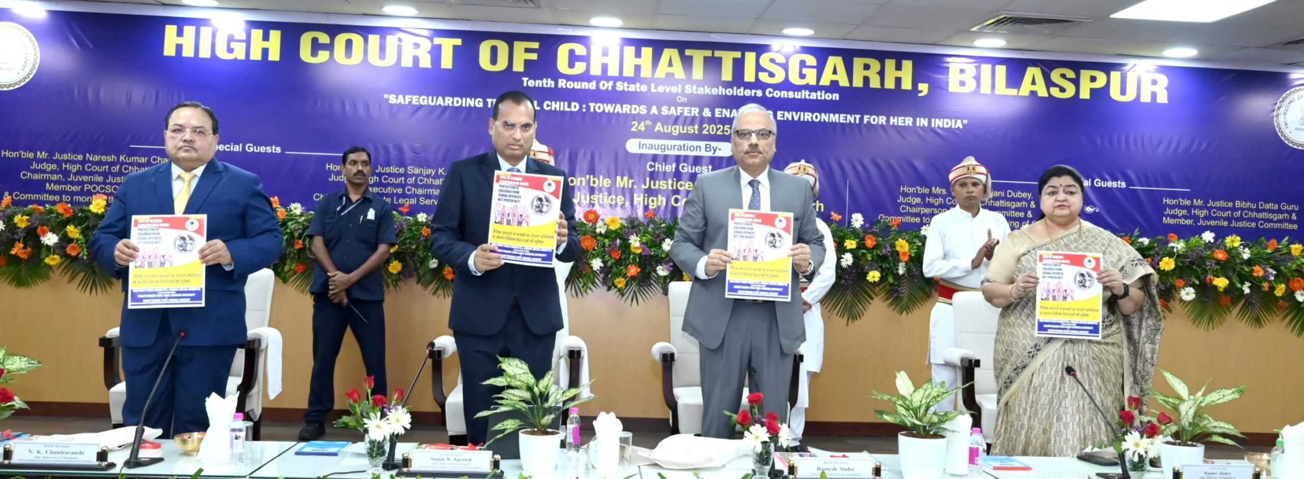 न्यायालय द्वारा की गई तथा सह-अध्यक्षता माननीय श्री न्यायमूर्ति नरेश कुमार चंद्रवंशी एवं माननीय श्री न्यायमूर्ति बिभु दत्ता गुरु, न्यायाधीशगण, छत्तीसगढ़ उच्च न्यायालय द्वारा की गई। इस कार्यक्रम मेंविधि विभाग के प्रमुख सचिव, प्रभारी रजिस्ट्रार जनरल, रजिस्ट्री के अधिकारीगण, न्यायिक अकादमी के निदेशक एवं अधिकारीगण, छत्तीसगढ़ राज्य विधिक सेवा प्राधिकरण के सदस्य सचिव एवं अधिकारीगण, उच्च न्यायालय विधिक सेवा समिति के सचिव, फास्ट ट्रैक/फास्ट ट्रैक स्पेशल न्यायालयो के पीठासीन अधिकारी, किशोर न्याय बोर्डके प्रधान मजिस्ट्रेट , जिला विधिक सेवा प्राधिकरणों के सचिव, प्रशिक्षुसिविल न्यायाधीशगण , महिला एवं बाल विकास विभाग, शिक्षा विभाग, पंचायती राज एवं ग्रामीण विकास विभाग तथा समाज कल्याण विभाग के सचिव एवं प्रतिनिधि, स्वास्थ्य विभाग के प्रतिनिधि, बिलासपुर रेंज के पुलिस महानिरीक्षक एवं पुलिस विभाग के प्रतिनिधि, कलेक्टर एवं पुलिस अधीक्षक बिलासपुर, राज्य बाल अधिकार संरक्षण आयोग की अध्यक्ष एवं प्रतिनिधि तथा यूनिसेफ के प्रतिनिधि उपस्थित थे।