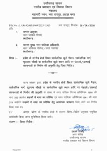 नगरीय प्रशासन विभाग ने सभी नगरीय निकायों को भेजे परिपत्र में कहा है कि राज्य के नगरीय क्षेत्रों में स्थित सार्वजनिक खुले मैदानों, सार्वजनिक मार्गों, फुटपाथों, चौराहों, सार्वजनिक खुले स्थानों आदि पर पंडाल या अस्थाई संरचनाओं के निर्माण की अनुमति के संबंध में सड़कों में बाधा के प्रतिषेध हेतु आवश्यक प्रावधान किए जाने का निर्णय लिया गया है। विभाग ने सभी निकायों को परिपत्र में उल्लेखित दिशा-निर्देशों के अनुसार समुचित कार्यवाही सुनिश्चित करने के निर्देश दिए हैं।