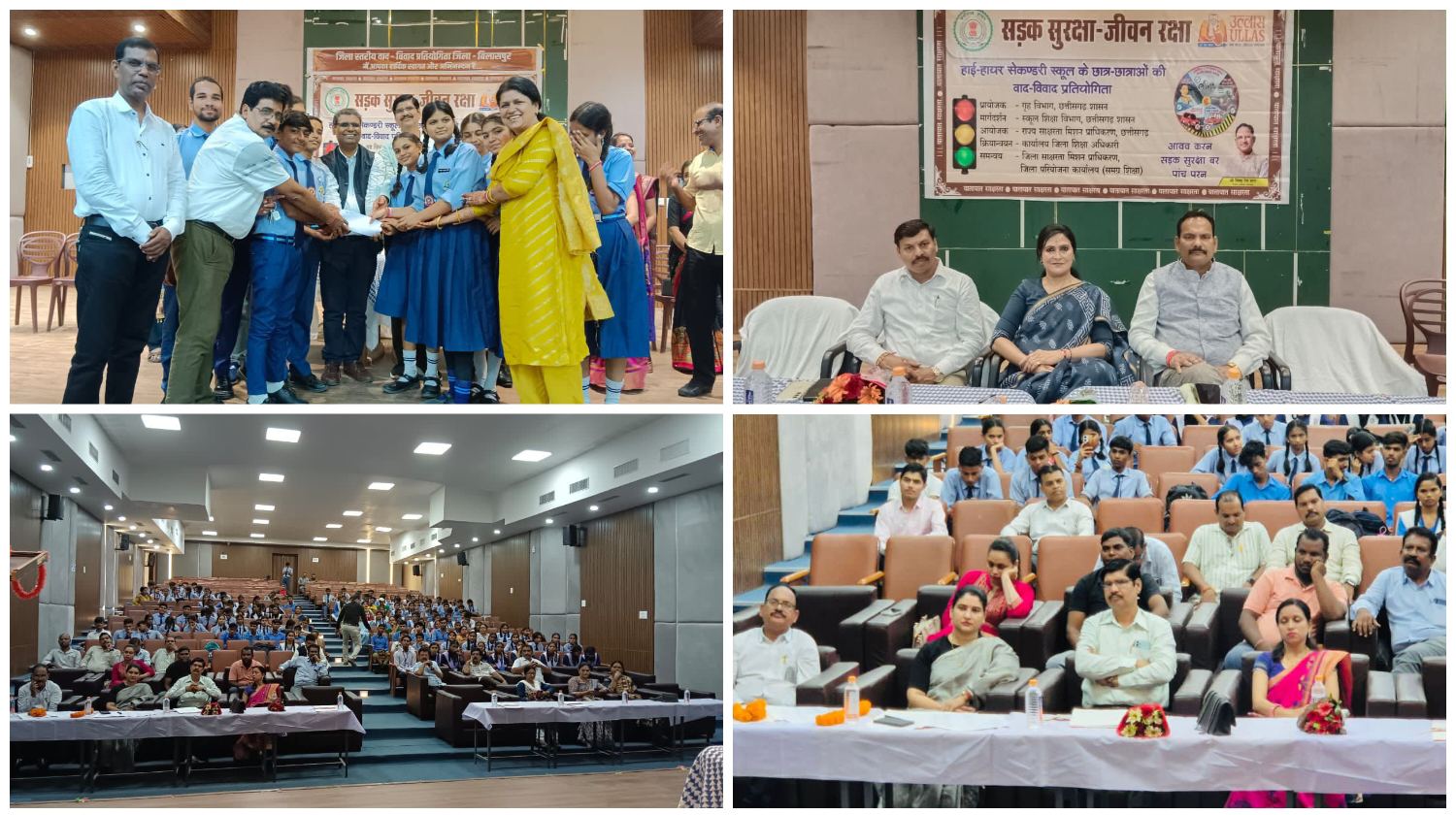 बिलासपुर // “सड़क सुरक्षा जीवन रक्षा ” विषय पर जिला स्तरीय वाद-विवाद प्रतियोगिता का आयोजन शनिचरी बाजार स्थित पं. देवकीनंदन दीक्षित सभाभवन में किया गया। कार्यक्रम का शुभारंभ बिलासपुर की महापौर श्रीमती पूजा विधानी एवं जिला पंचायत अध्यक्ष श्री राजेश सूर्यवंशी ने दीप प्रज्वलित कर किया। इस अवसर पर जनप्रतिनिधियों एवं शिक्षा विभाग के वरिष्ठ अधिकारी उपस्थित रहे।प्रतियोगिता का आयोजन छत्तीसगढ़ शासन, स्कूल शिक्षा विभाग के निर्देशानुसार सड़क दुर्घटनाओं में कमी लाने और आमजन को यातायात नियमों के प्रति जागरूक करने हेतु किया गया।
