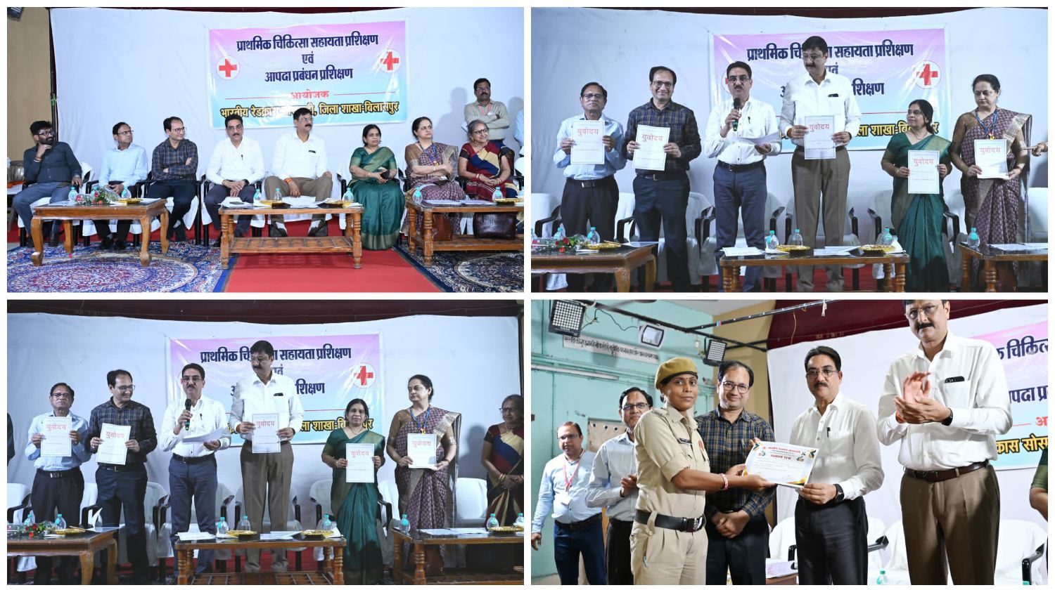 बिलासपुर :— भारतीय रेडक्रॉस सोसायटी द्वारा आयोजित प्राथमिक सहायता प्रशिक्षण एवं आपदा प्रबंधन प्रशिक्षण का समापन समारोह संभागायुक्त श्री सुनील जैन के मुख्य आतिथ्य में सम्पन्न हुआ। आईजी श्री संजीव शुक्ला और कलेक्टर एवं भारतीय रेडक्रॉस सोसायटी के अध्यक्ष श्री संजय अग्रवाल भी मौजूद थे। कार्यक्रम के द्वितीय दिवस के प्रथम सत्र में राज्य स्तरीय मास्टर ट्रेनर श्री बालमुकुंद दुबे द्वारा प्रशिक्षार्थियों को प्राथमिक चिकित्सा, सांप के काटने से तुरंत बचाव, बैंडेजिंग आदि का प्रशिक्षण दिया गया। सिम्स चिकित्सालय की डॉ. मधुमिता मूर्ति द्वारा सीपीआर का प्रशिक्षण दिया गया। साथ ही अतिरिक्त पुलिस अधीक्षक ग्रामीण श्रीमती अर्चना झा ने जिले में नशा मुक्ति के लिए चलाए जा रहे चेतना अभियान के बारे में जानकारी दी। अतिरिक्त पुलिस अधीक्षक यातायात श्री राम गोपाल करियारे ने यातायात के नियमों सहित यातायात से जुड़ी अन्य जानकारी साझा की।
