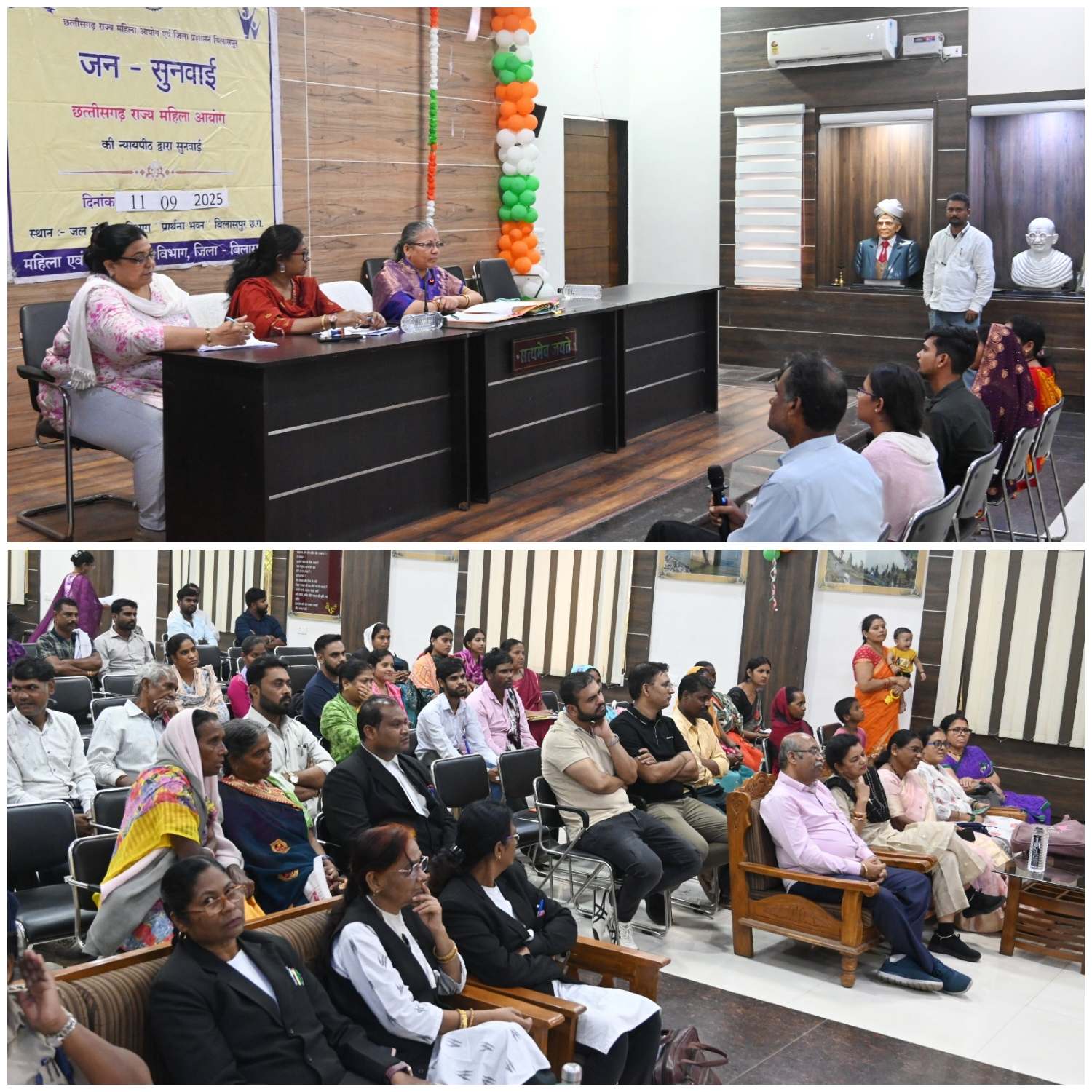 बिलासपुर :— छत्तीसगढ़ राज्य महिला आयोग की अध्यक्ष किरणमयी नायक प्रार्थना सभा जल संसाधन विभाग बिलासपुर में महिला उत्पीड़न से संबंधित प्रस्तुत 25 प्रकरणों में जनसुनवाई की। छत्तीसगढ़ राज्य महिला आयोग की अध्यक्ष डॉ. किरणमयी नायक की अध्यक्षता में आज प्रदेश स्तर पर 342 वीं व बिलासपुर जिले में 20वीं सुनवाई हुई।