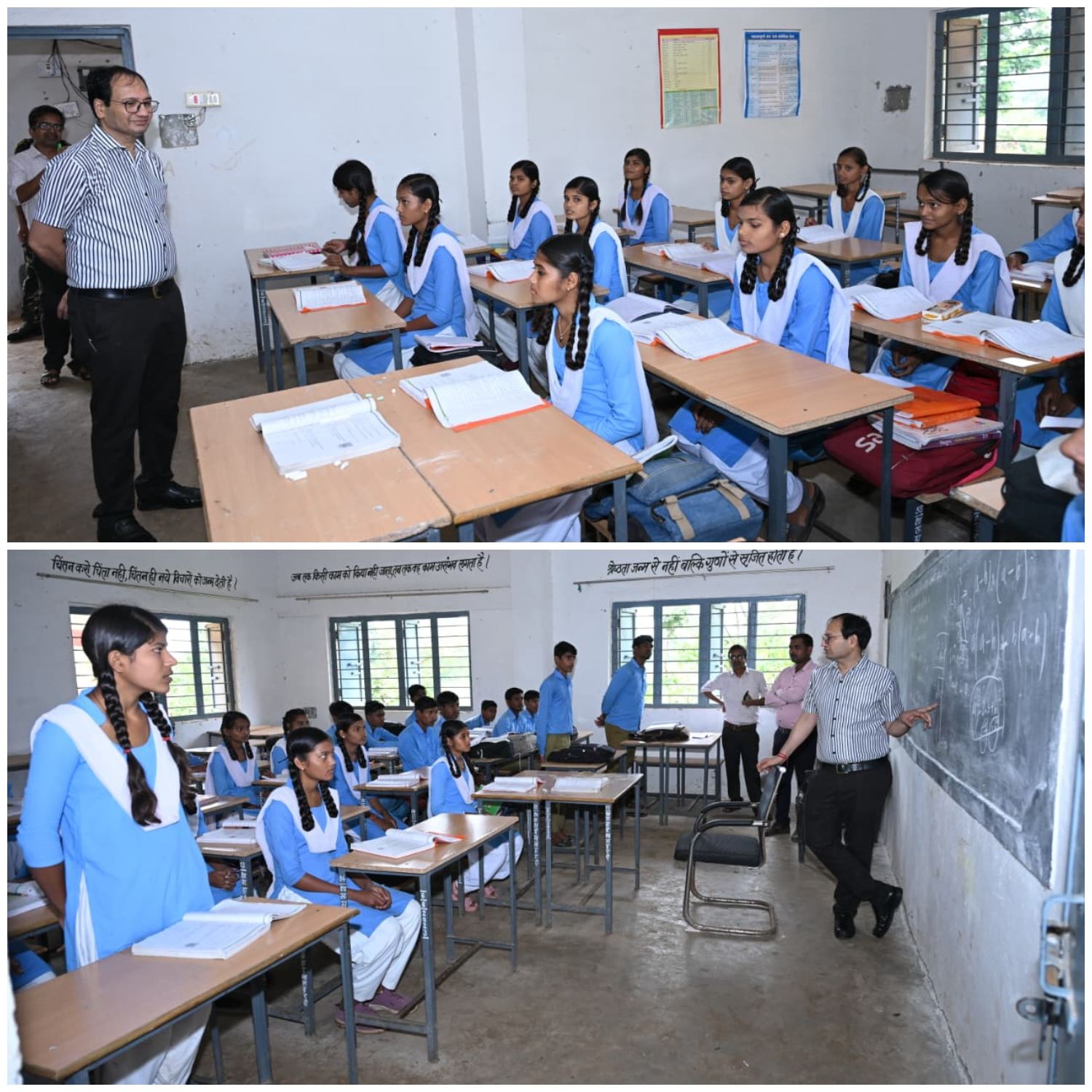 बिलासपुर // स्वच्छता एवं सेवा अभियान के तहत तखतपुर विकासखण्ड के दौरे पर पहुंचे कलेक्टर संजय अग्रवाल ने आज हाई स्कूल हरदी का अचानक दौरा किया। जिला पंचायत के सीईओ संदीप अग्रवाल भी दौरे में साथ थे। बिना अवकाश स्वीकृति के प्रभारी प्राचार्य रमेश साहू एवं शिक्षक निर्मल शर्मा नदारद पाये गये। उनके विरूद्ध अनुशासनात्मक कार्रवाई के लिए जिला शिक्षा अधिकारी को शो-कॉज नोटिस जारी करने के निर्देश दिए। स्कूल के अंदर और बाहर गंदगी का आलम देख कलेक्टर बेहद नाराज हुए। उन्होंने विशेष स्वच्छता अभियान चलाकर संपूर्ण परिसर को साफ-सफाई करने की सख्त लहजे में हिदायत दी। कलेक्टर ने बच्चों की कक्षा में पहुंचकर शिक्षा गुणवत्ता का भी परीक्षण किया। कक्षा नवमीं में सामान्य अंग्रेजी और दसवीं में गणित की पढ़ाई हो रही थी। पूछताछ में सामान्य से सवालों के जवाब बच्चे नहीं दे पाए। अंग्रेजी की लाईनें ठीक से पढ़ने एवं हिज्जे में उन्हें दिक्कतें हो रही थीं। कक्षा दसवीं में बच्चों को कलेक्टर ने पाईथागोरम नियम की सरल व्याख्या कर समझाए। कलेक्टर ने बच्चों से उनके भावी केरियर की जानकारी ली। कलेक्टर ने कहा कि अपने जीवन का लक्ष्य बनाकर उसे प्राप्त करने में लग जाइए। सफलता जरूर हाथ लगेगी। देश एवं समाज में जितने भी बड़े लोग हुए हैं, सबने जीवन की शुरूआत में ही सपने देखे और उसे प्राप्त करने के लिए जी-तोड़ मेहनत किया। स्कूल के अलावा घर में भी पाठ को दुहराने की सलाह कलेक्टर ने दी। कलेक्टर ने पढ़ाई के साथ शारीरिक स्वास्थ्य एवं खेल कूद के साथ भी जीवन में संतुलन बनाने की जरूरत बताई।