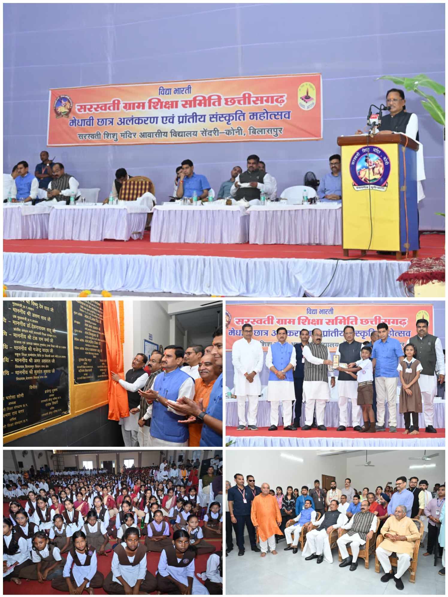 बिलासपुर // मुख्यमंत्री विष्णु देव साय ने कोनी स्थित सरस्वती शिशु मंदिर परिसर में नव निर्मित सरस्वती महाविद्यालय भवन का लोकार्पण किया। उन्होंने विद्याभारती द्वारा आयोजित भव्य सम्मान समारोह में प्रदेश के 33 जिलों के सरस्वती स्कूलों से चयनित 24 मेधावी छात्र छात्राओं और विभिन्न सांस्कृतिक गतिविधियों एवं महोत्सवों में उत्कृष्ट प्रदर्शन करने वाले प्रतिभागियों को सम्मानित किया। मुख्यमंत्री साय ने कहा कि विद्या भारती संस्था भारत की संस्कृति और परंपरा को आगे बढ़ाने में विशिष्ट योगदान दे रही है। उन्होंने विद्यार्थियों से आह्वान किया कि वे राष्ट्र गौरव निर्माण में अपना योगदान दें। कार्यक्रम की अध्यक्षता उप मुख्यमंत्री अरुण साव ने की। केंद्रीय राज्यमंत्री तोखन साहू, उच्च शिक्षा मंत्री टंक राम वर्मा, स्कूल शिक्षा मंत्री से गजेंद्र यादव विशिष्ट अतिथि के रुप में मौजूद रहे। बिल्हा विधायक धरम लाल कौशिक, तखतपुर विधायक धर्मजीत सिंह भी इस अवसर पर उपस्थित थे।