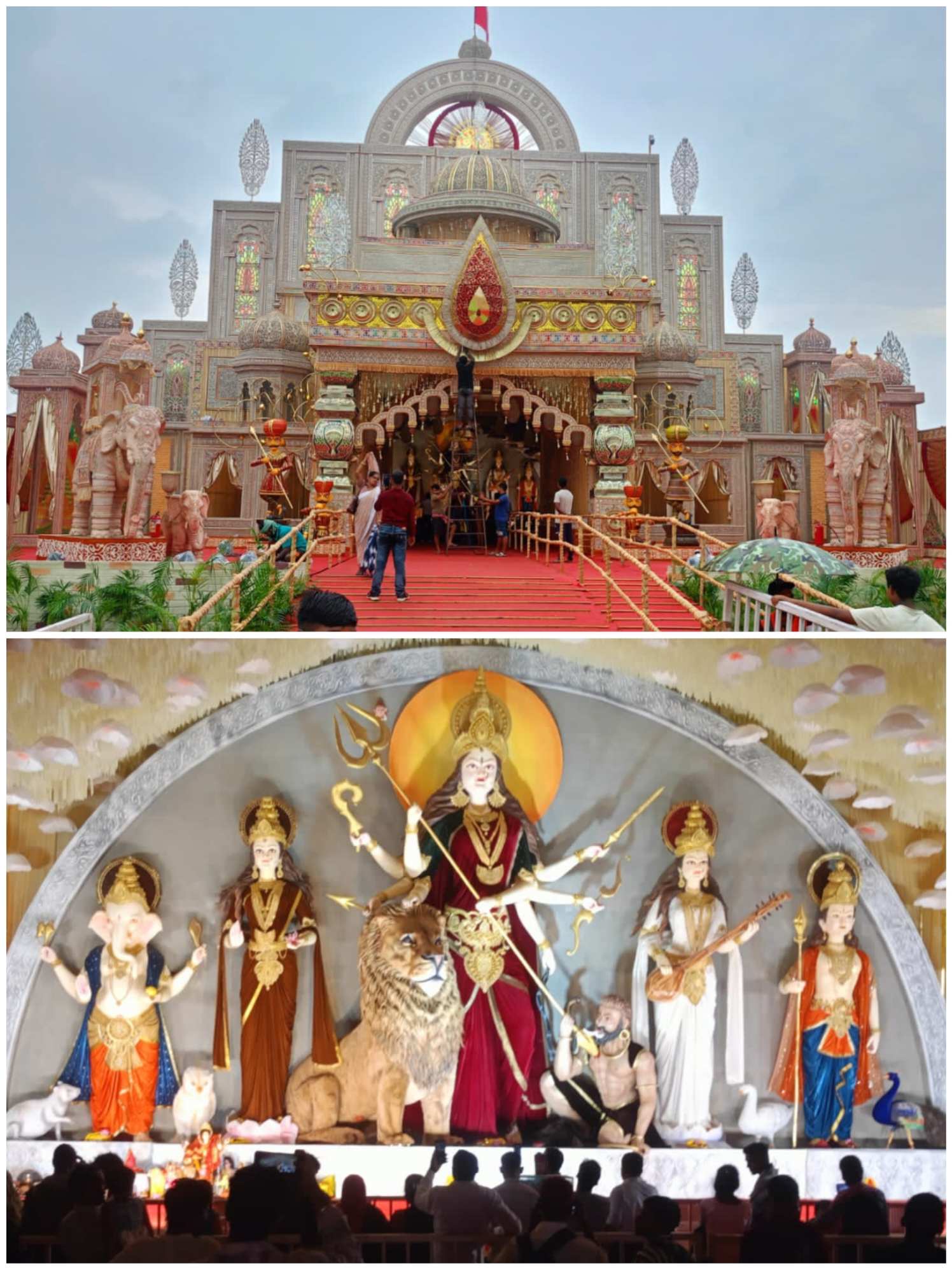 बिलासपुर // गोड़पारा की आदर्श दुर्गोत्सव समिति ने अपने 50वें स्वर्ण जयंती वर्ष में मां दुर्गा की भव्य स्थापना अरपा नदी के तट पर रिवर व्यू रोड पर की। इस अवसर पर 25 फीट ऊंची और 45 फीट चौड़ी मां दुर्गा की विशाल मूर्ति को 25,000 वर्ग फीट के भव्य पंडाल में स्थापित किया गया, जिसे कोलकाता के कारीगरों ने राजस्थानी महल की थीम पर सजाया। पंडाल में चार धाम—केदारनाथ, बद्रीनाथ, जगन्नाथपुरी और द्वारकाधाम—की झांकियां आकर्षण का केंद्र रहीं। इसके साथ ही मां काली, भगवान शिव और नरसिंह अवतार की झांकियां भी श्रद्धालुओं को भक्ति में डुबो रही थी।