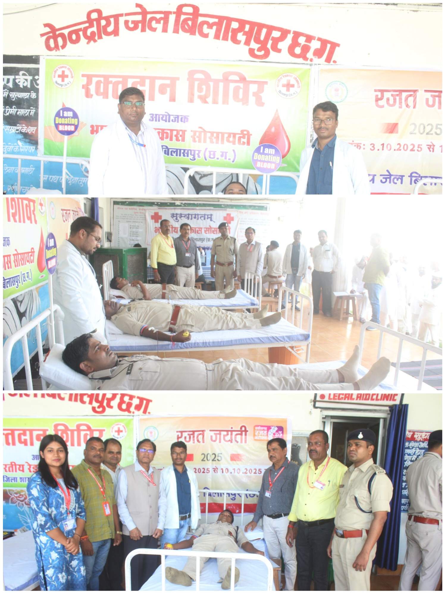 बिलासपुर // केन्द्रीय जेल में छत्तीसगढ़ में 3 अक्टूबर से 10 अक्टूबर 2025 तक छत्तीसगढ़ राज्य निर्माण की रजत जयंती के अवसर पर प्रतिदिन जेल सुधारात्मक कार्यक्रम का आयोजन किया जा रहा है। इसी क्रम में केन्द्रीय जेल में रक्तदान शिविर का आयोजन किया गया, जिसमें सिम्स अस्पताल से ब्लड सेंटर स्टाफ से डॉ मनोज क्षत्रिय, डॉ असीम आनंद मसीह, श्री विवेक कुमार शर्मा, श्री किशोर सिदार, श्री सुमन गिरी, श्रीमती कौशल्या पात्रे, श्रीमती आँचल शास्त्री, श्री अजय कुमार, श्री आनंद अग्निहोत्री, श्री सुरेश वर्मा, एवं रेडक्रास सोसायटी बिलासपुर से श्री सौरभ सक्सेना, श्री सुशील राजपूत, अन्नू पटेल, लेमा देवांगन, आरती गुप्ता उपस्थित हुए। जेल स्टाफ ने काफी उत्साह के साथ रक्तदान शिविर में शामिल होकर रक्तदान किया गया। इसके अलावा बंदी भाइयों के द्वारा शहीदों के नाम कार्यक्रम में देशभक्ति गीतों के साथ कार्यक्रम आयोजित किया गया। कार्यक्रम में श्री खोमेश मंडावी जेल अधीक्षक, श्रीमती कोकिला वर्मा, प्रभारी उप जेल अधीक्षक, श्री रामपाल सिंह कंवर, परिवीक्षा एवं कल्याण अधिकारी तथा अधिकारी, कर्मचारी उपस्थित रहे।