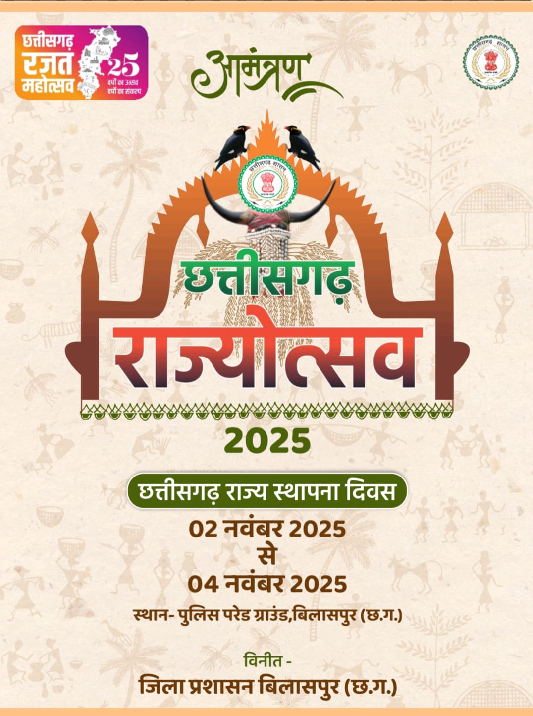 बिलासपुर // छत्तीसगढ़ राज्य स्थापना दिवस के अवसर जिला स्तरीय राज्योत्सव का भव्य आयोजन पुलिस परेड मैदान में 2 नवम्बर से 4 नवम्बर 2025 तक किया जाएगा। राज्योत्सव के पहले दिन केंद्रीय आवासन एवं शहरी विकास राज्य मंत्री श्री तोखन साहू कार्यक्रम का शुभारंभ करेंगे। कार्यक्रम की अध्यक्षता उप मुख्यमंत्री श्री अरूण साव करेंगे। विशिष्ट अतिथि के तौर पर विधायक सर्वश्री श्री धरमलाल कौशिक, श्री अमर अग्रवाल, श्री धर्मजीत सिंह, श्री सुशांत शुक्ला, श्री दिलीप लहरिया, श्री अटल श्रीवास्तव, क्रेडा के अध्यक्ष श्री भूपेन्द्र सवन्नी, छत्तीसगढ़ पाठ्य पुस्तक निगम के अध्यक्ष श्री राजा पाण्डेय, महापौर श्रीमती पूजा विधानी, जिला पंचायत अध्यक्ष श्री राजेश सूर्यवंशी, नगर निगम के सभापति श्री विनोेद सोनी शामिल होंगे।