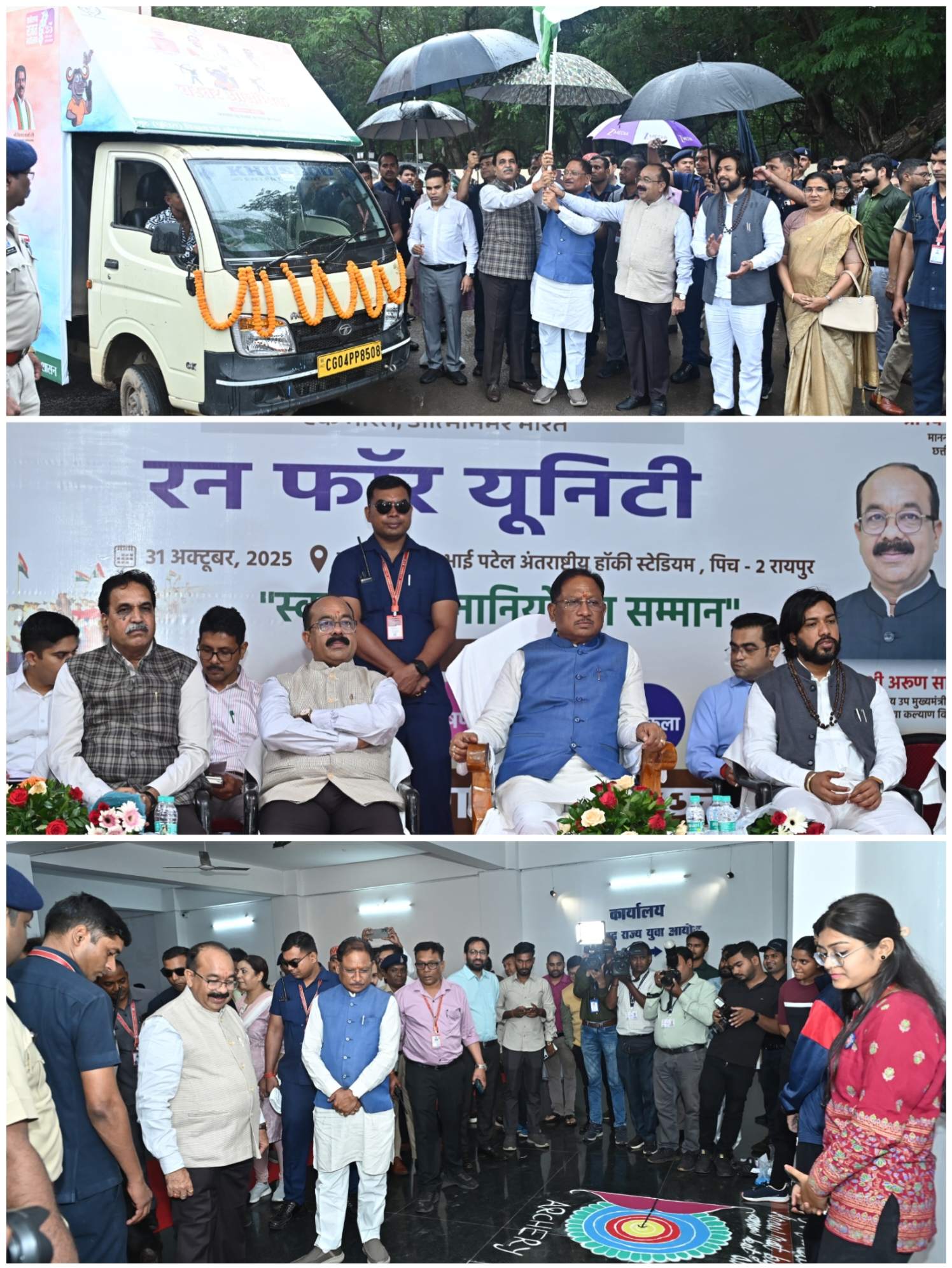 खेल एवं युवा कल्याण विभाग द्वारा राष्ट्रीय एकता दिवस पर रन फॉर यूनिटी के साथ ही महाविद्यालयीन छात्र-छात्राओं के लिए रंगोली, चित्रकला, भाषण और काव्य पाठ प्रतियोगिताओं का भी आयोजन किया गया था। मुख्यमंत्री श्री साय ने राष्ट्रीय एकता दिवस कार्यक्रम में स्वतंत्रता सेनानियों के परिजनों को शाल और श्रीफल भेंटकर सम्मानित किया। उन्होंने कार्यक्रम स्थल पर प्रतिभागियों द्वारा बनाए गए रंगोली और चित्रों का अवलोकन किया। उन्होंने कार्यक्रम में मौजूद लोगों को स्वदेशी अपनाने और भारत में निर्मित वस्तुओं के उपयोग की शपथ दिलाई। मुख्यमंत्री ने रंगोली, चित्रकला, भाषण और काव्य पाठ प्रतियोगिताओं के विजेताओं को पुरस्कार प्रदान किए। उन्होंने हरी झंडी दिखाकर रन फॉर यूनिटी के प्रतिभागियों को रवाना किया। उन्होंने बस्तर ओलंपिक के प्रचार रथ को भी हरी झंडी दिखाई। ये प्रचार रथ बस्तर संभाग के सभी जिलों में पहुंचकर बस्तर ओलंपिक का प्रचार-प्रसार करेंगे।