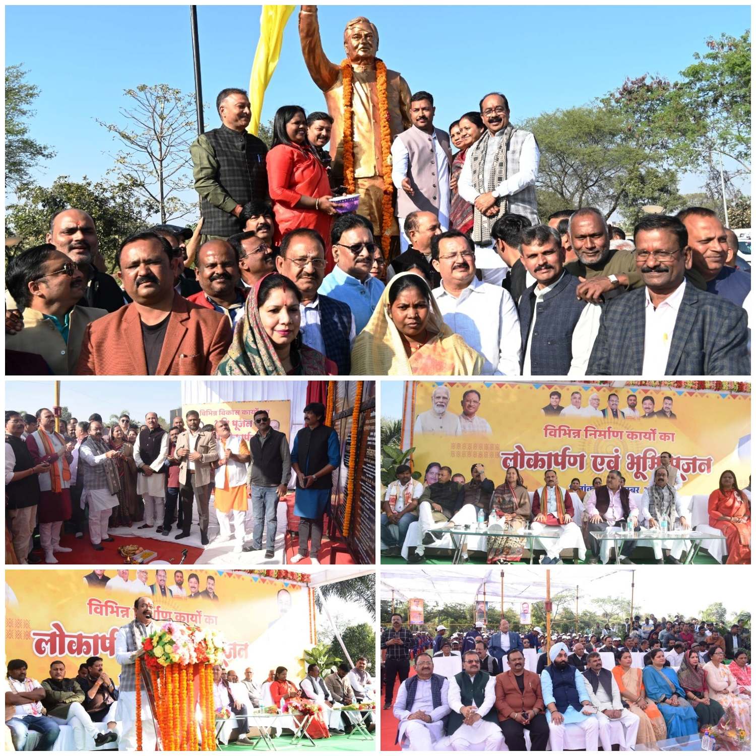 बिलासपुर :— उप मुख्यमंत्री अरुण साव ने सरगुजा संभागीय मुख्यालय अंबिकापुर में 82 करोड़ 23 लाख 71 हजार रुपए के विभिन्न विकास कार्यों का लोकार्पण एवं भूमिपूजन किया। उन्होंने शहर के स्वच्छता पार्क में 50 लाख रुपए की लागत से नवनिर्मित अटल परिसर के लोकार्पण के साथ ही लोक निर्माण, लोक स्वास्थ्य यांत्रिकी तथा नगरीय प्रशासन एवं विकास विभाग के विभिन्न कार्यों का भूमिपूजन भी किया। स्वास्थ्य मंत्री श्याम बिहारी जायसवाल, महिला एवं बाल विकास मंत्री लक्ष्मी राजवाड़े तथा पर्यटन एवं संस्कृति मंत्री राजेश अग्रवाल भी लोकार्पण-भूमिपूजन कार्यक्रम में शामिल हुए।