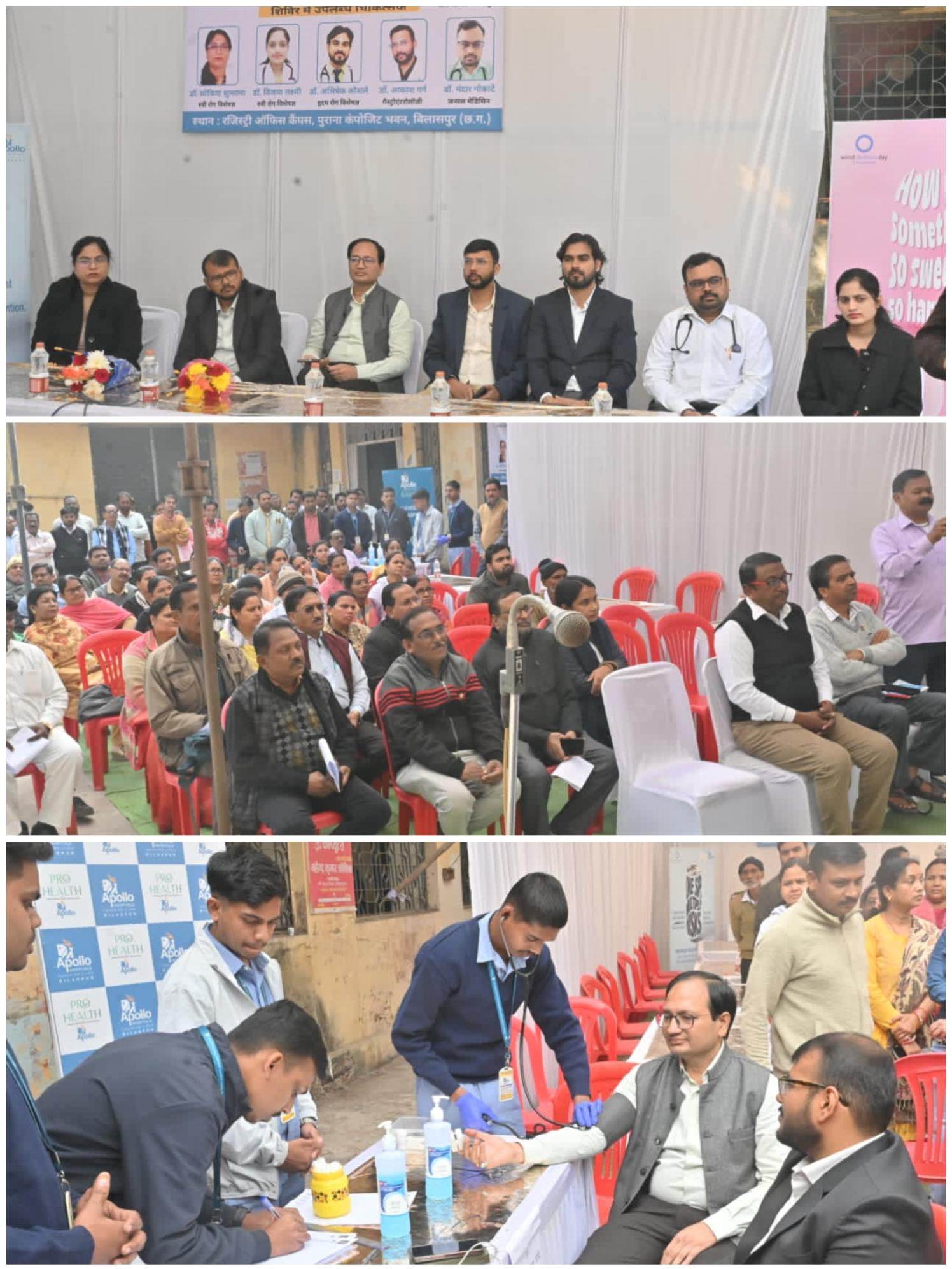बिलासपुर // जिला प्रशासन के सहयोग से अपोलो हॉस्पिटल द्वारा निःशुल्क चिकित्सा शिविर का आयोजन ओल्ड कंपोजिट बिल्डिंग में किया गया। ओल्ड कंपोजिट बिल्डिंग परिसर में आयोजित शिविर का शुभारंभ कलेक्टर श्री संजय अग्रवाल ने अपनी स्वास्थ्य जांच कराकर किया। उन्होंने अपने स्वास्थ्य के प्रति सजग रखने की अपील की और कहा कि स्वस्थ रहकर ही हम अपने परिवार समाज और देश के प्रति अपने दायित्वों का भलीभांति निर्वहन कर सकते है। कलेक्टर श्री संजय अग्रवाल ने अपोलो प्रबंधन के इस पहल की सराहना की। इस अवसर पर निगम कमिश्नर श्री अमित कुमार भी मौजूद रहे। शिविर में 200 से अधिक लोगों की जांच की गई और विशेषज्ञों द्वारा परामर्श दिया गया।