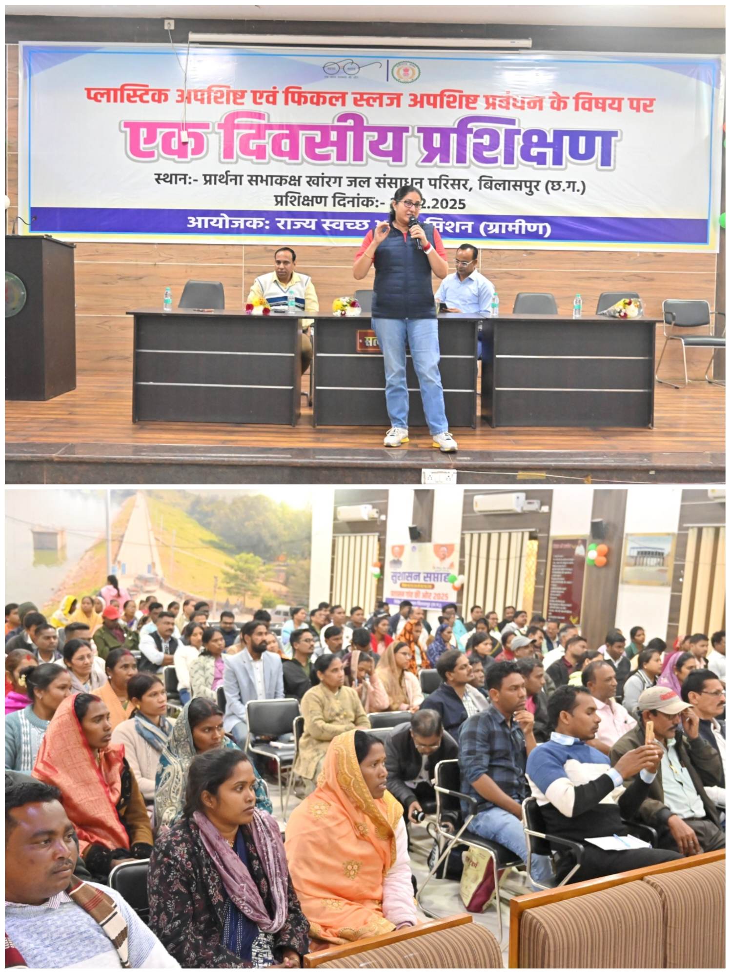 बिलासपुर :— स्वच्छ भारत मिशन (ग्रामीण) अंतर्गत जल संसाधन परिसर स्थित प्रार्थना सभाकक्ष में प्लास्टिक अपशिष्ट एवं फिकल स्लज अपशिष्ट प्रबंधन विषय पर एक दिवसीय संभाग स्तरीय प्रशिक्षण कार्यशाला का आयोजन किया गया। प्रशिक्षण में बिलासपुर संभाग के सभी आठ जिलों बिलासपुर, कोरबा, रायगढ़, जांजगीर-चांपा, मुंगेली, जीपीएम, सक्ती और सारंगढ़-बिलाईगढ़ के जिला समन्वयक, जिला सलाहकार, विकासखंड व क्लस्टर समन्वयक, संबंधित ग्रामों के सरपंच-सचिव तथा स्व-सहायता समूहों के प्रतिनिधि शामिल हुए।