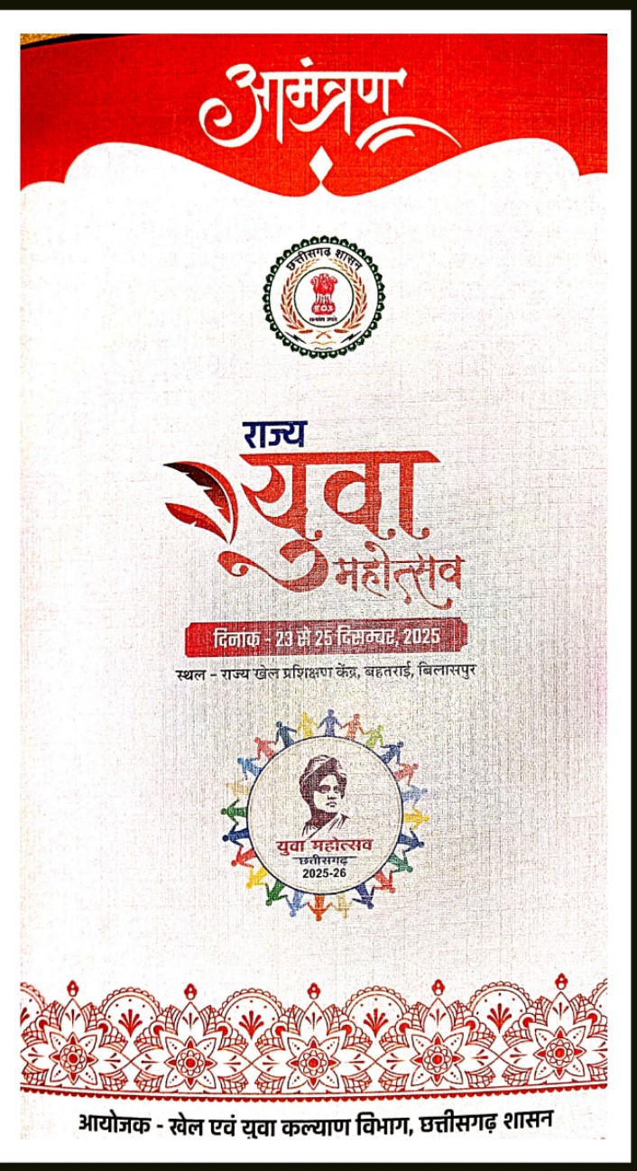 बिलासपुर :— राज्य शासन के खेल एवं युवा कल्याण विभाग द्वारा 23 दिसम्बर से 25 दिसम्बर तक बिलासपुर के राज्य खेल प्रशिक्षण केंद्र बहतराई में राज्य युवा महोत्सव का आयोजन किया जा रहा है। मुख्यमंत्री श्री विष्णु देव साय 23 दिसम्बर को इसका शुभारंभ करेंगे। महोत्सव में 14 सांस्कृतिक और साहित्यिक विधाओं में प्रदेश के 3000 युवा अपनी प्रतिभा दिखाएंगे। शुभारंभ समारोह में छत्तीसगढ़ की मेजबानी में होने वाले पहले ‘खेलो इंडिया ट्राइबल गेम्स’ की लॉन्चिंग भी की जाएगी। उप मुख्यमंत्री तथा खेल एवं युवा कल्याण मंत्री श्री अरुण साव शुभारंभ समारोह की अध्यक्षता करेंगे। केन्द्रीय आवासन और शहरी कार्य राज्य मंत्री श्री तोखन साहू, छत्तीसगढ़ विधानसभा के अध्यक्ष डॉ. रमन सिंह और उप मुख्यमंत्री श्री विजय शर्मा अति विशिष्ट अतिथि के रूप में कार्यक्रम में शामिल होंगे। राज्यपाल श्री रमेन डेका 25 दिसम्बर को समापन समारोह में मुख्य अतिथि के रूप में शामिल होंगे।