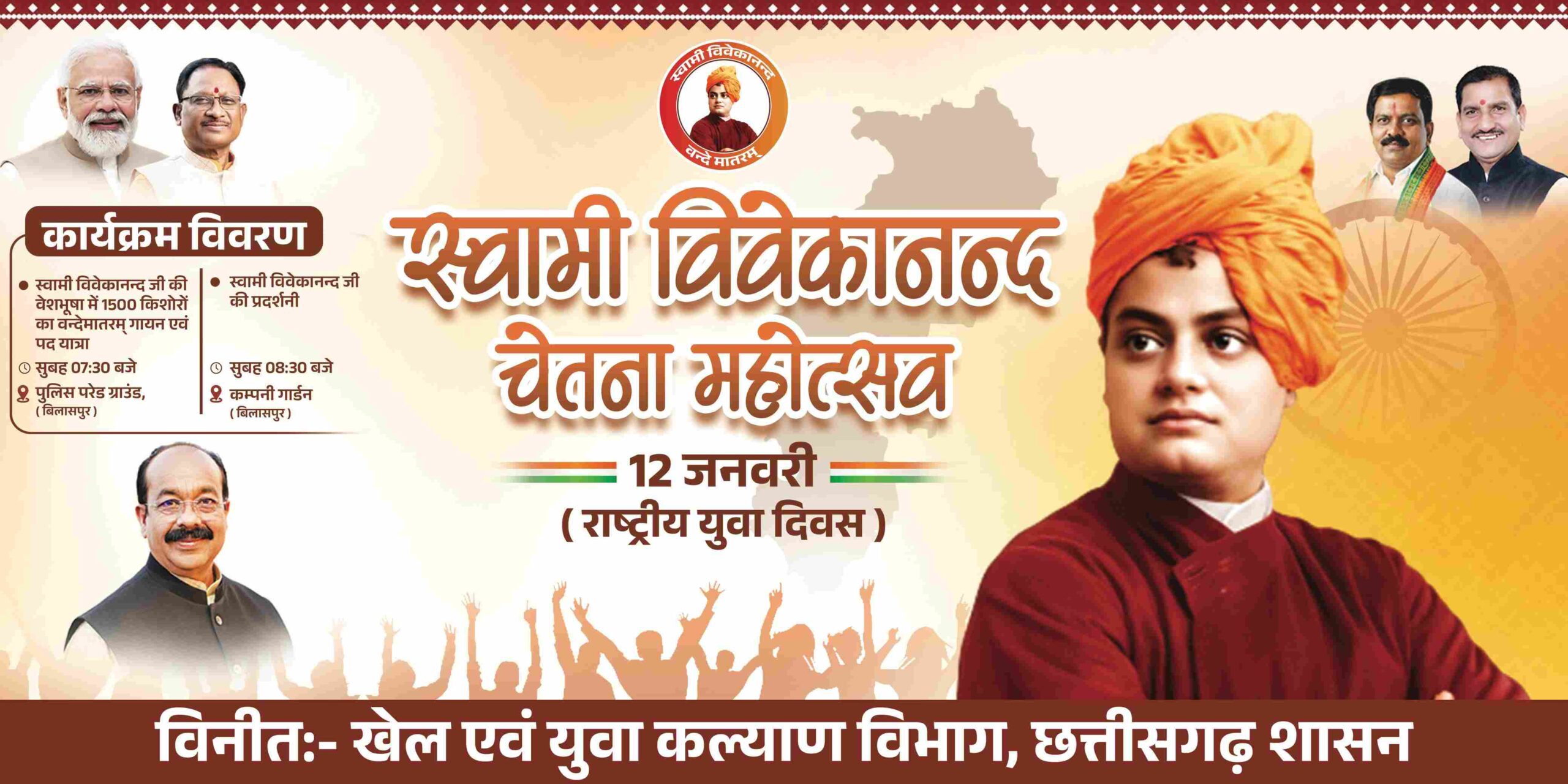 डिप्टी सीएम अरुण साव ने बताया आज 12 जनवरी को उनके नेतृत्व में खेल एवं युवा कल्याण विभाग बिलासपुर में विश्व रिकॉर्ड बनाने जा रहा है। पुलिस ग्राउंड बिलासपुर में 1500 से अधिक बच्चे विश्व रिकॉर्ड बनाने स्वामी विवेकानंद की वेशभूषा में इकट्ठे होंगे और वंदे मातरम् का गान करेंगे। एक साथ 1500 स्कूली बच्चे नशा ना करने की शपथ लेंगे। साथ ही कंपनी गार्डन, बिलासपुर में विवेकानंद जी की प्रदर्शनी लगाई जाएगी। उप मुख्यमंत्री अरुण साव ने जानकारी दी कि पुलिस ग्राउंड बिलासपुर में 5500 स्क्वायर फीट से बड़ी आकर्षक और विशाल रंगोली से भी स्वामी विवेकानंद का चित्र बनाया जा रहा है।