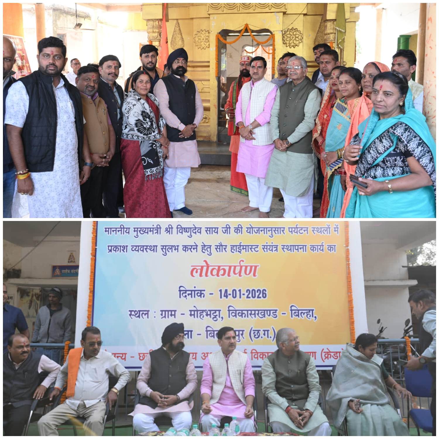 बिलासपुर // केंद्रीय आवासन एवं शहरी विकास राज्यमंत्री तोखन साहू के मुख्य आतिथ्य में ग्राम मोहभट्ठा में स्वयंभू भुनेश्वर मंदिर के पास 10 लाख 75 हजार रूपए की लागत से स्थापित 2 सोलर हाईमास्ट संयंत्र का लोकार्पण किया गया। कार्यक्रम में अतिविशिष्ट अतिथि के तौर पर बिल्हा विधायक श्री धरमलाल कौशिक, विशिष्ट अतिथि क्रेडा अध्यक्ष श्री भूपेन्द्र सवन्नी मौजूद रहे। कार्यक्रम में मुख्य अतिथि श्री तोखन साहू ने कहा कि सोलर हाईमास्ट संयंत्र लगने से क्षेत्र में रात्रिकालीन प्रकाश व्यवस्था सुदृढ़ होगी तथा नागरिकों को आवागमन एवं सुरक्षा में सुविधा मिलेगी। यह योजना स्वच्छ एवं नवीनीकरण ऊर्जा को बढ़ावा देने की दिशा में एक महत्वपूर्ण योजना है। तत्पश्चात् अतिथिगणों ने स्वयंभू भुनेश्वर मंदिर में विधिवत् पूजा-अर्चना कर क्षेत्र तथा क्षेत्रवासियों की सुख-समृद्धि की कामना की। कार्यक्रम में जनप्रतिनिधि अधिकारीगण एवं बड़ी संख्या में स्थानीय नागरिक उपस्थित रहें। उल्लेखनीय है कि राज्य शासन की योजना अनुरूप पर्यटन स्थलों में प्रकाश व्यवस्था किया जा रहा है।