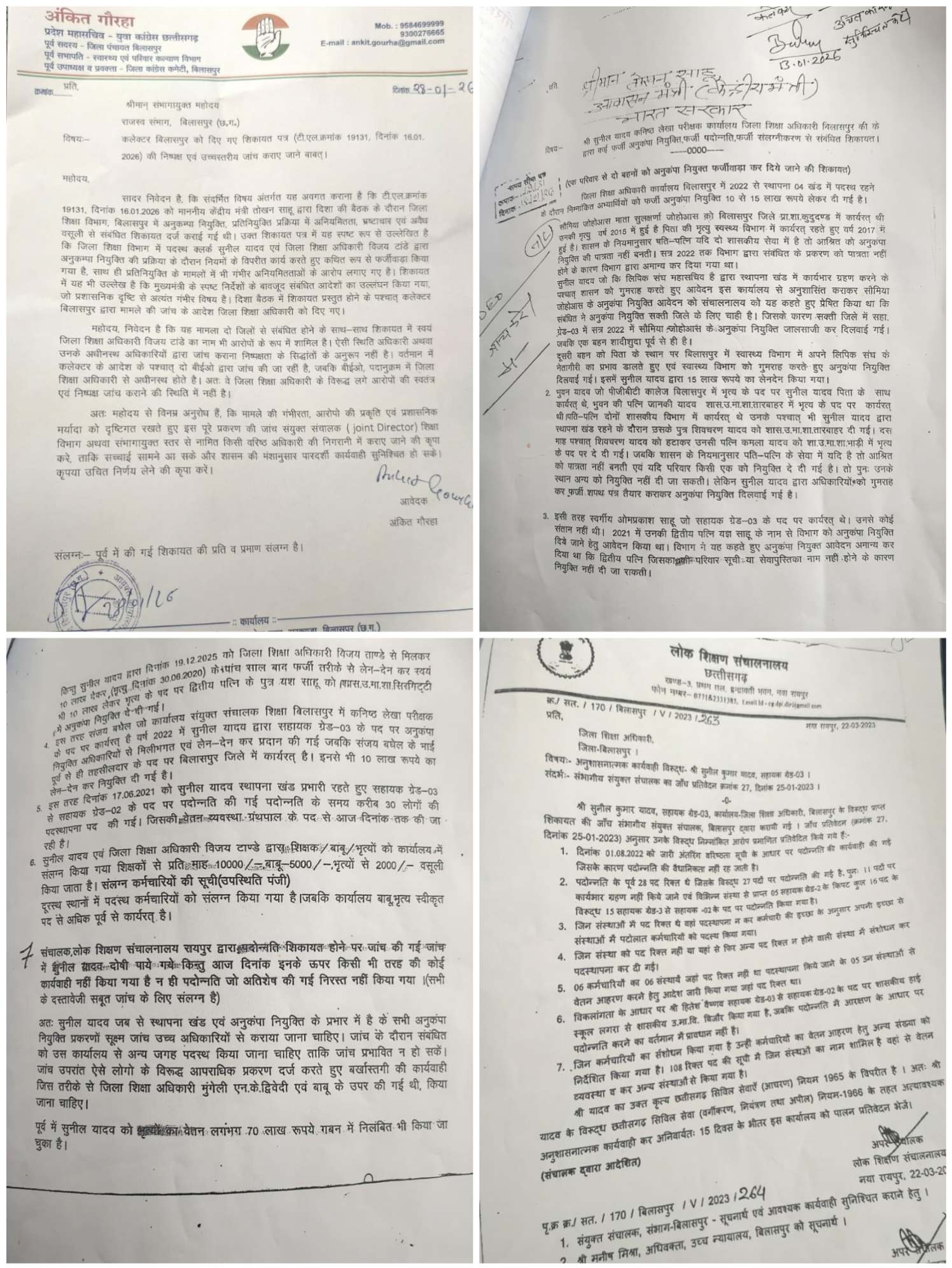 बिलासपुर :— शिक्षा विभाग में अनुकंपा नियुक्ति के नाम पर चल रहे कथित खेल ने प्रशासनिक ईमानदारी पर गंभीर सवाल खड़े कर दिए हैं। कांग्रेस नेता अंकित गौराहा ने पूरे मामले को “संगठित भ्रष्टाचार” करार देते हुए कमिश्नर को लिखित शिकायत सौंपी है और साफ कहा है कि यदि जांच ज्वाइंट डायरेक्टर शिक्षा या कमिश्नर स्तर पर नहीं हुई, तो मामला डीपी और सचिव स्तर तक ले जाया जाएगा। जरूरत पड़ी तो आंदोलन और धरना भी होगा।