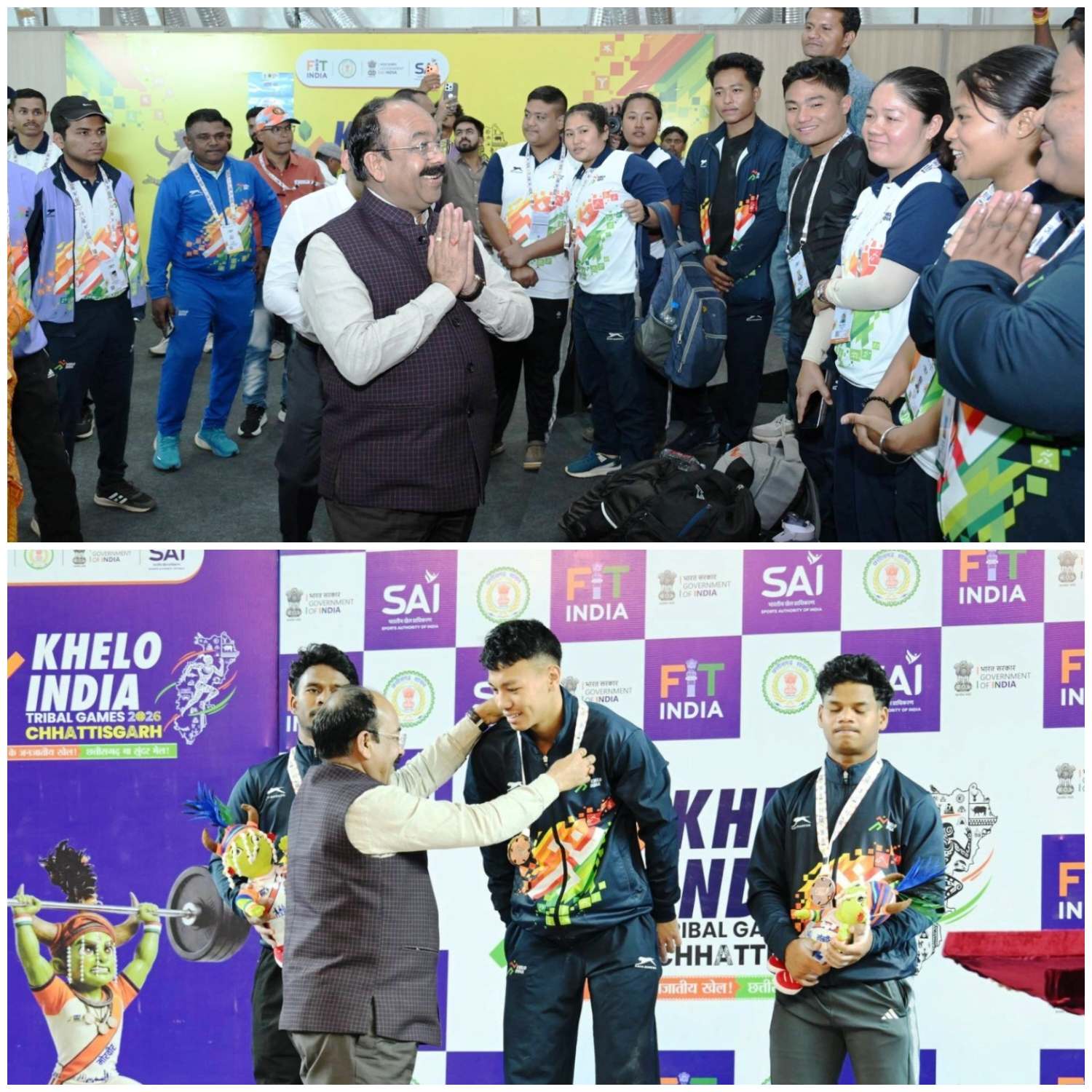 बिलासपुर :— उप मुख्यमंत्री तथा खेल एवं युवा कल्याण मंत्री अरुण साव रायपुर के पंडित रविशंकर विश्वविद्यालय मैदान पहुंचकर खेलो इंडिया ट्राइबल गेम्स के अंतर्गत आयोजित वेट-लिफ्टिंग स्पर्धा देखने पहुंचे। उन्होंने विभिन्न प्रदेशों से आए खिलाड़ियों से मिलकर उनकी हौसला अफजाई भी की। श्री साव ने आज के वेट-लिफ्टिंग स्पर्धा के विजेताओं को पदक भी वितरित किए। खेल एवं युवा कल्याण विभाग के सचिव श्री यशवंत कुमार भी इस दौरान मौजूद थे।