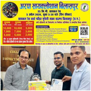 बिलासपुर :— फिटनेस, स्वास्थ्य और पर्यावरण के लिए ईंधन बचत के लिए साइक्लिंग संस्कृति को प्रोत्साहित करने के उद्देश्य से “अरपा सायक्लोथॉन बिलासपुर 2026” का आयोजन आगामी 5 अप्रैल को किया जाएगा। सुबह 5.30 मिनट पर शुरू होने वाली 25 किलोमीटर लंबी इस सायक्लोथॉन रेस का शुभारंभ मुंगेली नाका ग्राउंड, बिलासपुर से होगा। कलेक्टर संजय अग्रवाल और वरिष्ठ पुलिस अधीक्षक रजनेश सिंह ने नागरिकों से आयोजन में भागीदारी की अपील की है।